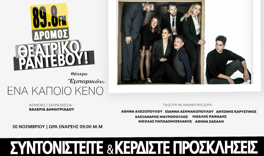 Ο ΔΡΟΜΟΣ 89,8 σας προσκαλεί σε μια ακόμη μοναδική θεατρική εμπειρία που ξεχωρίζει για τη βαθιά ανθρώπινη ματιά της και τη συγκινητική της δύναμη. Την Κυριακή 30 Νοεμβρίου, στις 20:00, στο Θέατρο Εμπορικόν, σας περιμένει το νέο πολυαναμενόμενο έργο της Βαλέριας Δημητριάδου, με τίτλο «Ένα κάποιο κενό».